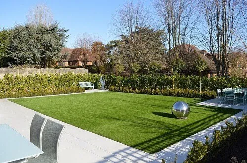 The design of this patio expands either side of the hedgerow forming a pathway around the garden. The stainless steel sphere ads a contemporary touch to the neatly trimmed garden grass.